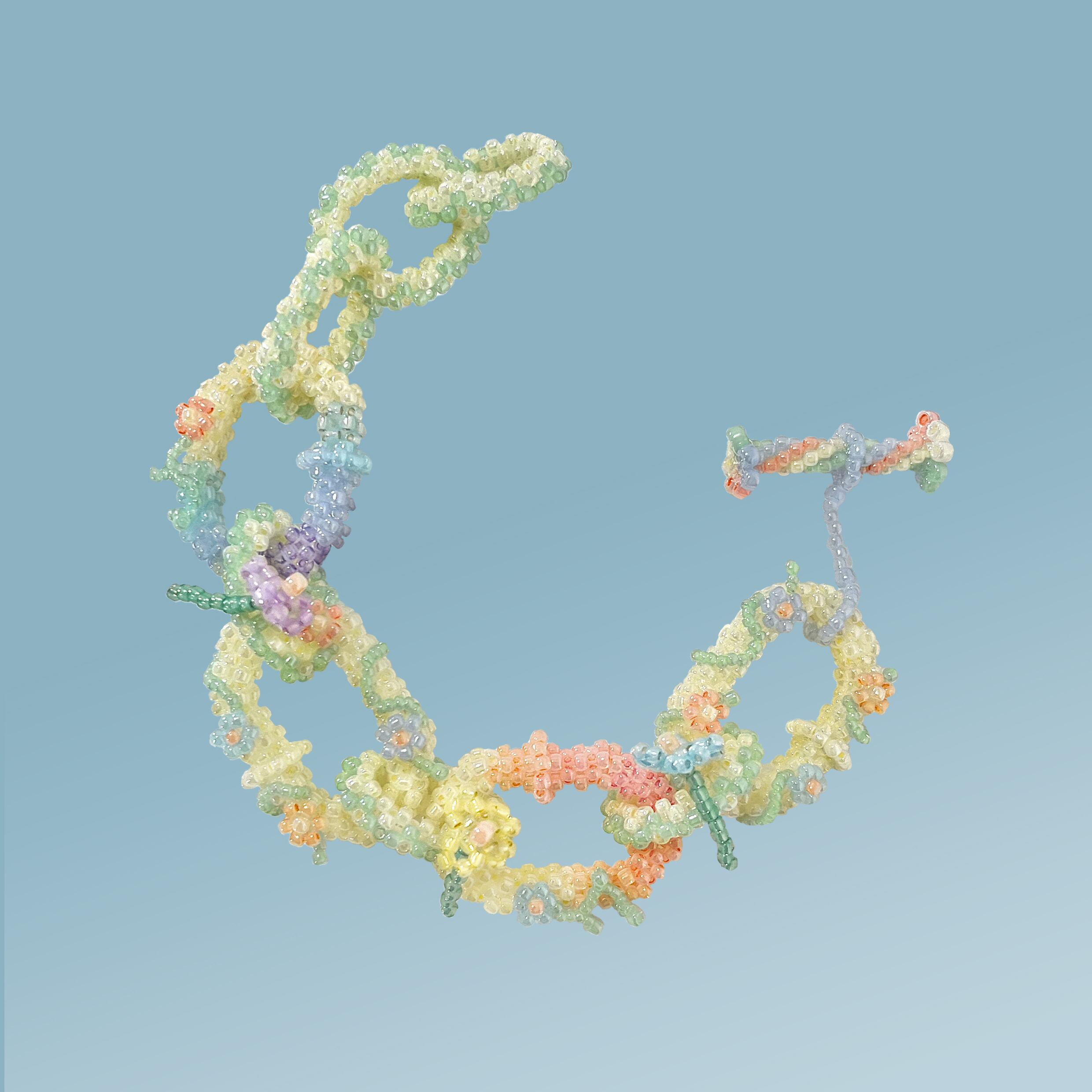実家にある古いニットの刺繍やプラスチックのボタンにあしらわれたレリーフなどから着想を得た花のモチーフをハードな印象のチェーンに落とし込んだ懐かしい暖かみを感じさせるブレスレット。