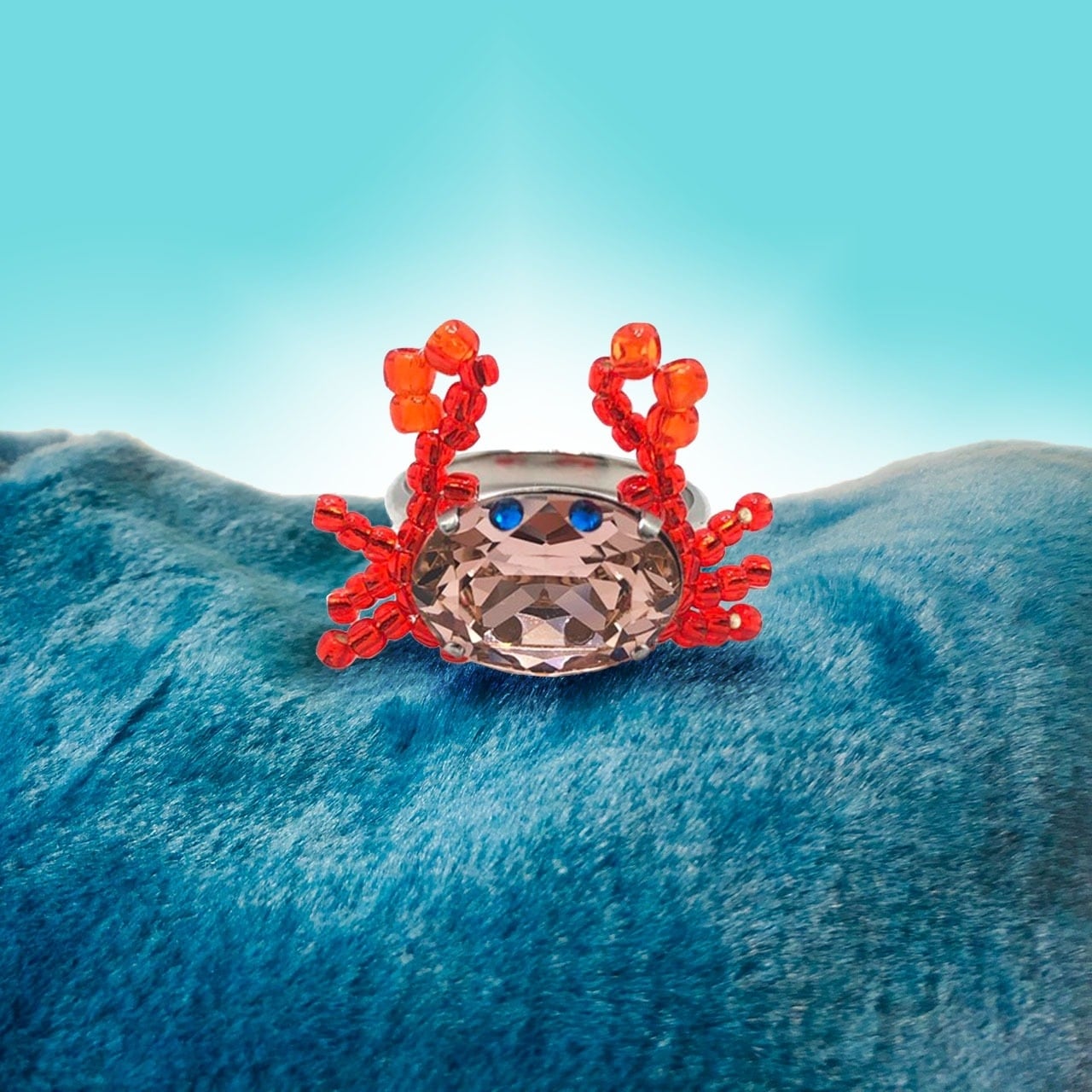 ビーズとスワロフスキーで仕立てたカニのリング。スタンダードカラーのREDは存在感を放つ華やかな輝き。