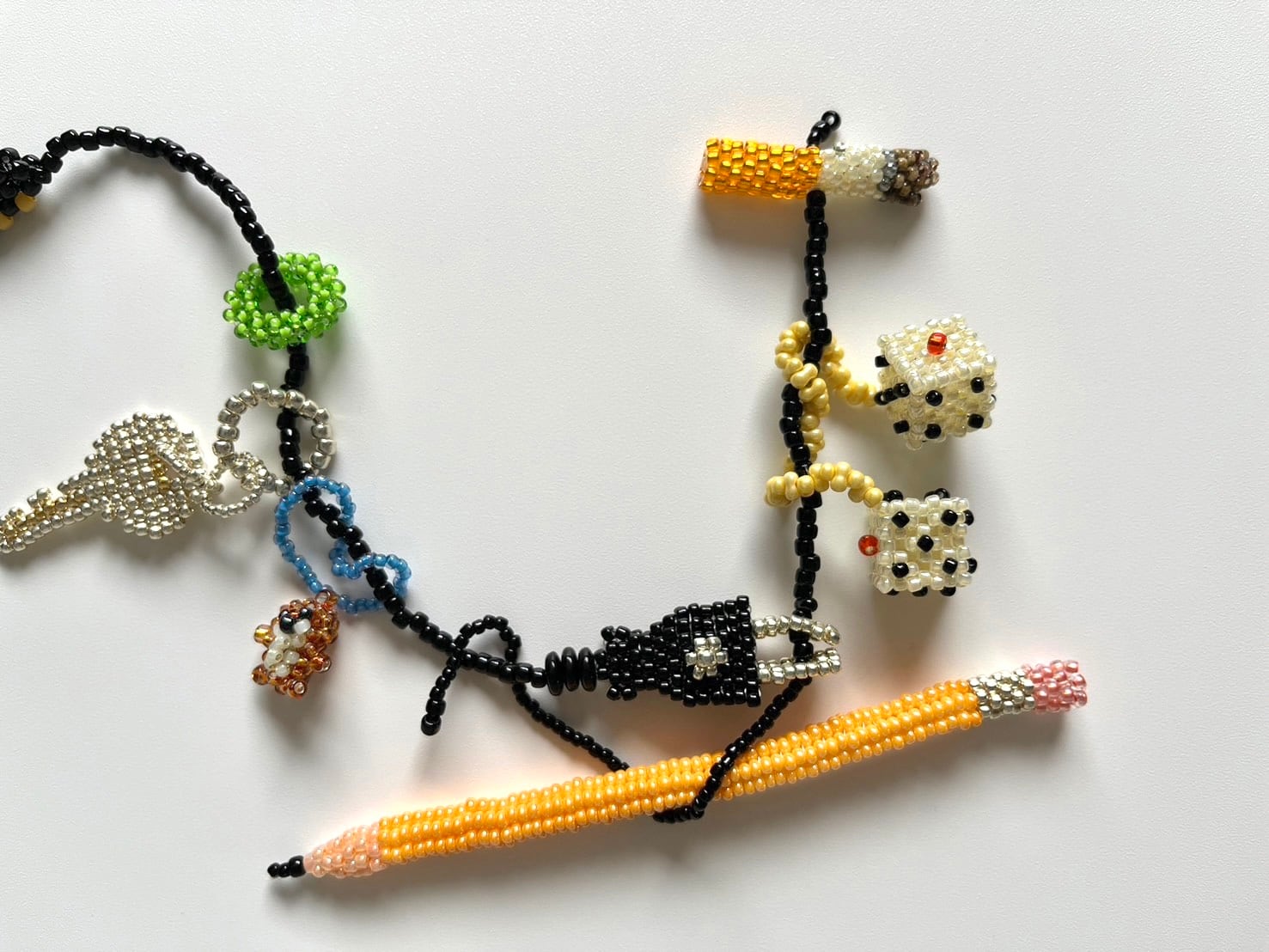 サイドの煙草モチーフを螺旋状の輪に通すことで長さを2段階に調節可能です。